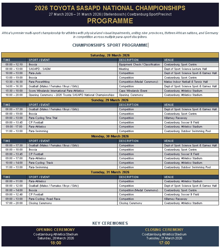 2026 Toyota SASAPD National Championships Programme